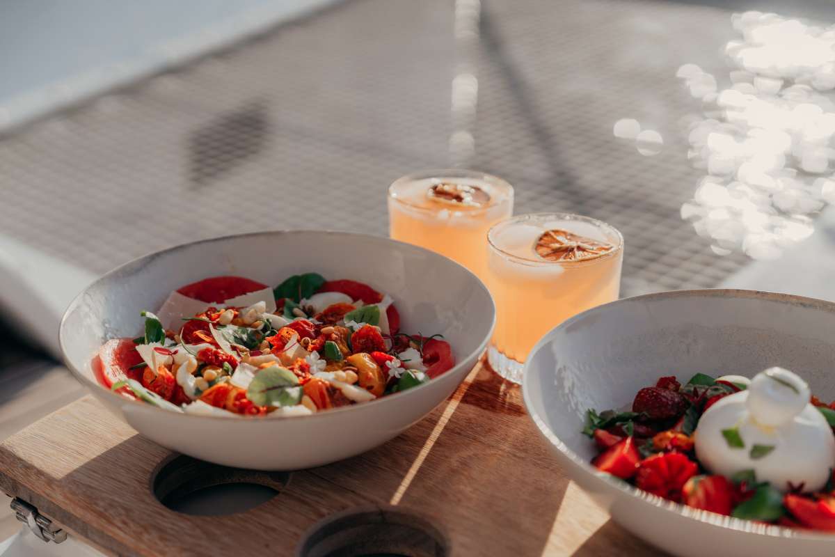 The culinary experience on ALMOSTA ROAD is a highlight of the luxury charter. Guests can expect a gourmet menu of Mediterranean and international dishes prepared with fresh local ingredients. For example, menus often feature Greek specialties like moussaka, grilled octopus, stuffed vegetables and tzatziki, all showcasing regional herbs and olive oil. Fresh seafood straight from local markets can be grilled or turned into seafood pasta, and an international chef can accommodate requests from sushi to vegan cuisine. To complement meals, the crew stocks fine Greek wines and craft cocktails, making every dining moment a delight amidst the beautiful Aegean scenery.