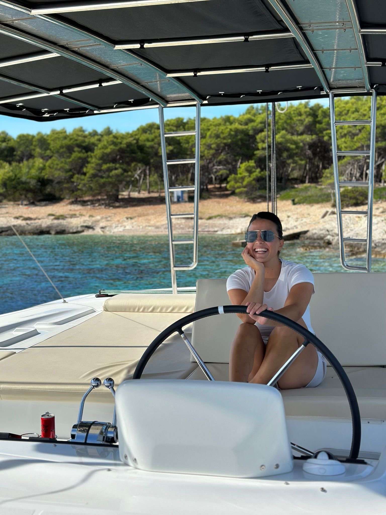 Charter Lagoon 620 Essense “DUOLIFE” in Croatia, available from Split, Marina Kaštela or Dubrovnik. DUOLIFE has four queen size beds, all ensuite, luxurious, well-designed cabins with side access to beds. A black window frame, a black mast, a boom, an additional roof on the second deck and grey sideboards add unique character to this catamaran. Fully equipped with an attractive sun lounge on the upper deck for sunbathing in the sun or shade. The super-wide stern with two accompanying ladders and a hydraulic platform lets you enter, leave and jump into the water quickly and easily or perhaps just catch some sun close to the sea.